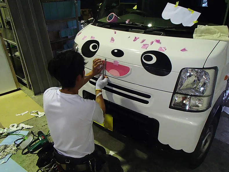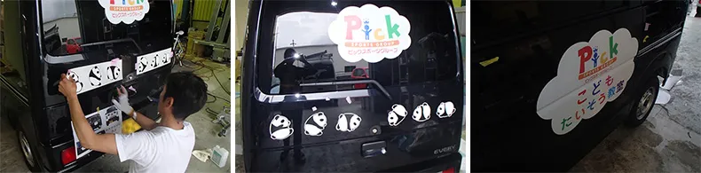 続いて、しっかりと位置を確認しながら、後部のパンダ達と体操教室のロゴを施工。側面にもロゴを貼ります。