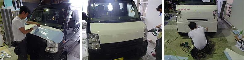ヒートガンで曲面に合わせてシートを貼りながら、細かな部分を丁寧にカットしながら貼っていきます。